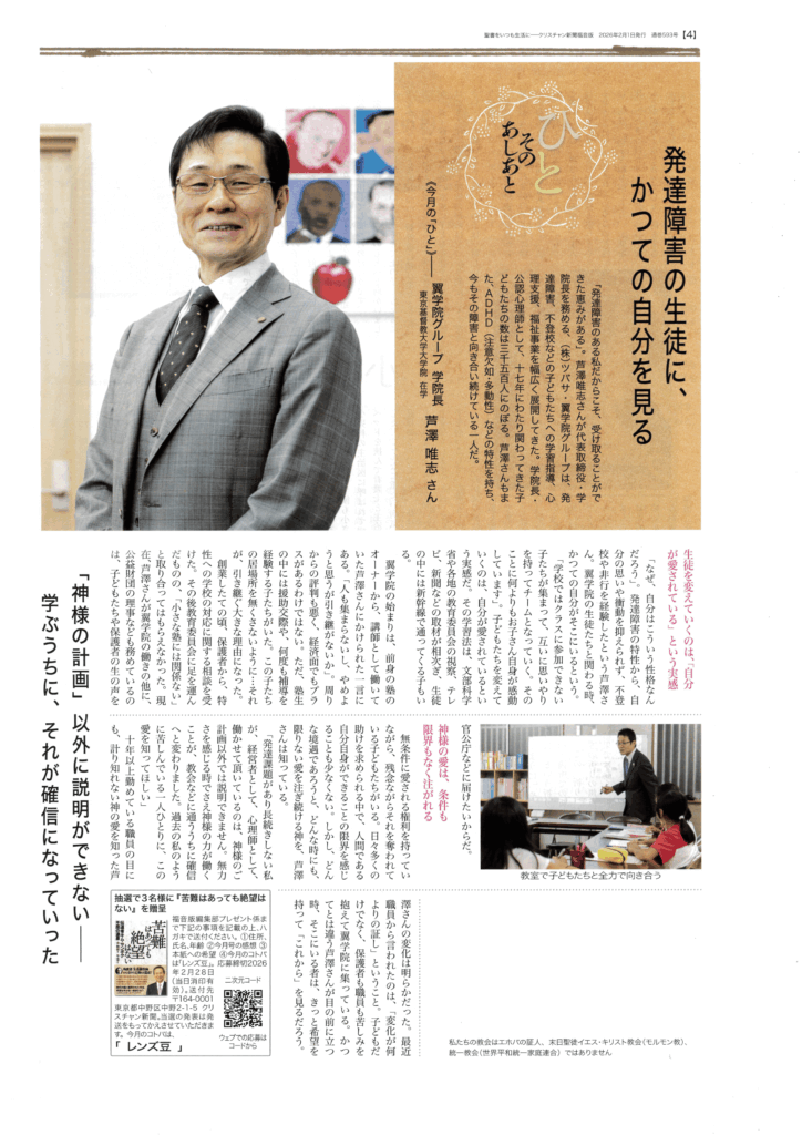 クリスチャン新聞福音版2026年2月号「ひと、そのあしあと」に学院長の芦澤唯志のこれまでの歩みが掲載されました。